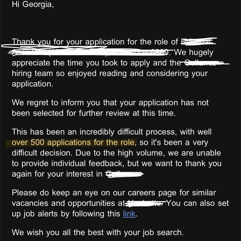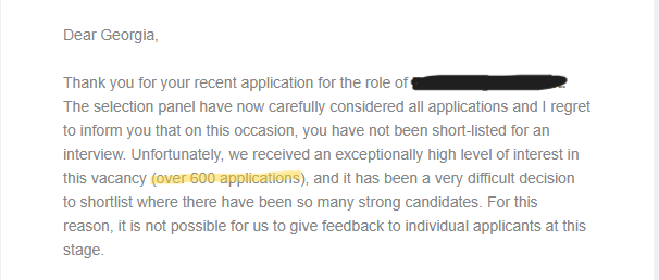 I used to see job rejection emails as a kind of personal failure, but now, when every single one mentions the sheer number of applications they received for one or two vacancies, it points to a flaw in the system. How can I really stand out in a crowd of even, say, 300 valid candidates?