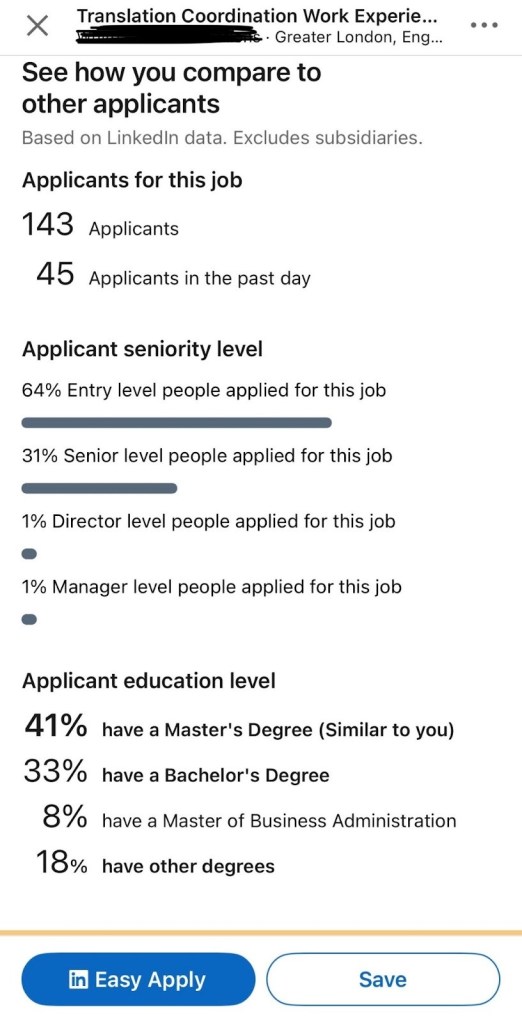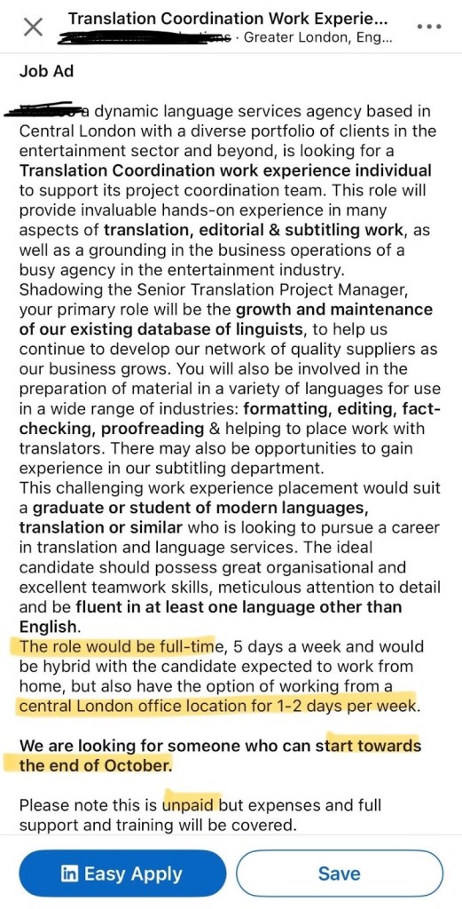 I have been seeing more and more unpaid Translation “Work Experience” offers in Central London pop up on my LinkedIn page, all with over a hundred applicants, like the one below. These offers include no mention of the length of the contract, no mention of any ascension in the company after a fixed period, nothing, not even the possibility of moving to a paid role. Yet, in just a few days, 143 people presented themself for the role below, of which almost half have a Master’s degree. So, after 80k+ debt in student loans, graduates are expected to work full-time for free in one of the world’s most expensive cities.