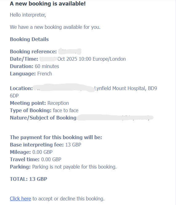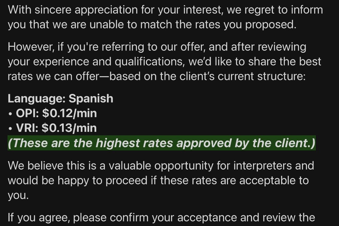 One of the reasons I have been interested in taking on a full-time position using my language skills has been my experience with freelancing. Whilst I absolutely adore my career (that’s why I studied it for 5 years at university), agencies offer new interpreters such insulting rates, like the whopping £5.40/h I was offered here for a “valuable opportunity” for an OPI agency (see below), that it makes you wonder how anyone can afford to gain experience as a linguist at all. I feel a moral obligation driven by many more senior interpreters’ complaints that accepting lower rates is impeding professionalisation and killing the industry to turn down agency offers that don’t cover travel expenses, or pay (below) minimum wage for jobs. However, new interpreters simply don’t have the experience to demand £0.1+/word for translation, or £40/h for interpreting. So, I atleast, find myself stuck between betraying my industry for experience, or working less (and earning less/gaining less experience), but upholding our values.